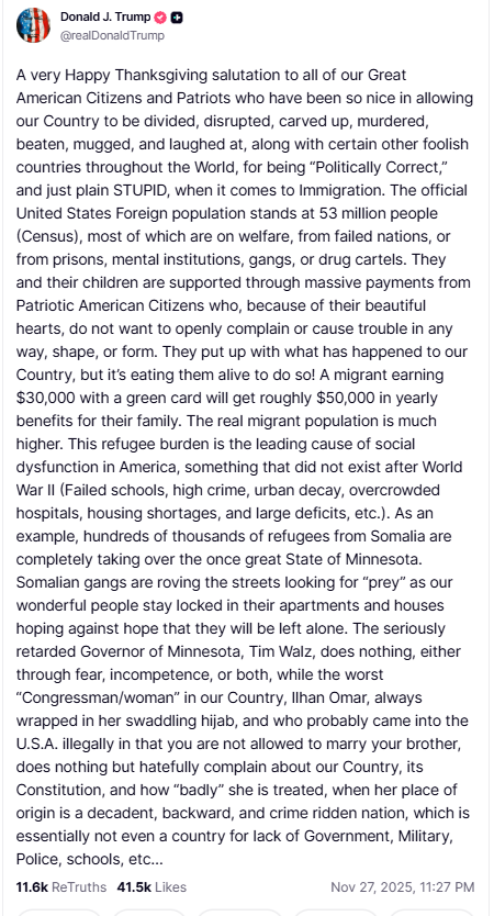 "The seriously retarded Governor of Minnesota, Tim Walz, does nothing, either through fear, incompetence, or both," Trump wrote. "Only REVERSE MIGRATION can fully cure this situation. Other than that, HAPPY THANKSGIVING TO ALL, except those that hate, steal, murder, and destroy everything that America stands for — You won’t be here for long!"