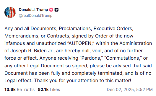 In a series of blistering Truth Social posts, Trump issued the sweeping revocation and warned recipients of Biden-era pardons and commutations that their documents now carry zero legal weight.