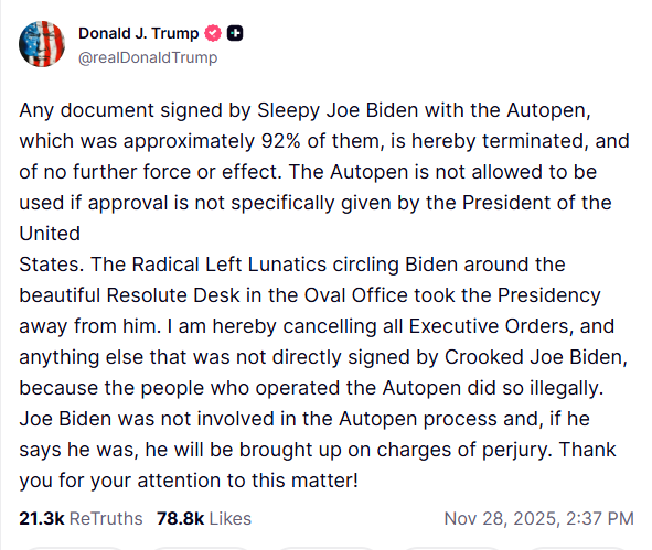 "The Radical Left Lunatics circling Biden around the beautiful Resolute Desk in the Oval Office took the Presidency away from him," Trump posted. "I am hereby cancelling all Executive Orders, and anything else that was not directly signed by Crooked Joe Biden, because the people who operated the Autopen did so illegally. Joe Biden was not involved in the Autopen process and, if he says he was, he will be brought up on charges of perjury. Thank you for your attention to this matter!"