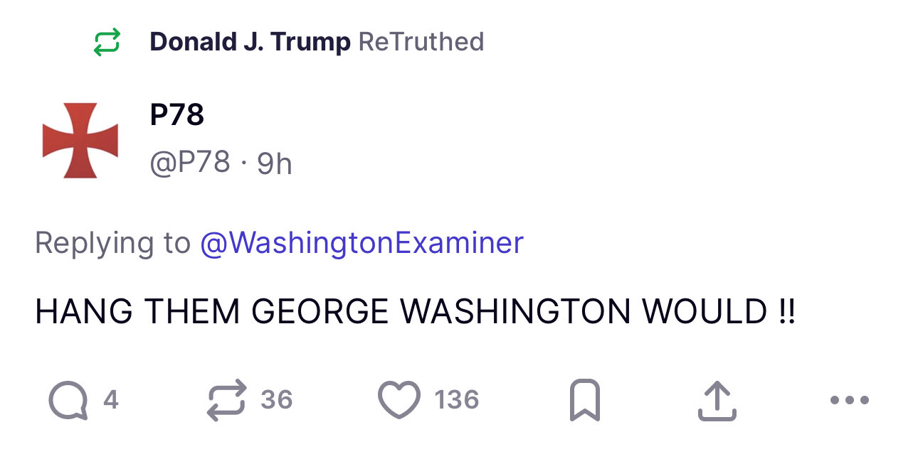 The president also reposted at least 16 messages from supporters, including one that read "HANG THEM GEORGE WASHINGTON WOULD" alongside an image of a gallows.