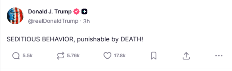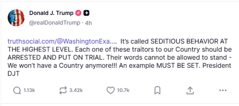 "It’s called SEDITIOUS BEHAVIOR AT THE HIGHEST LEVEL. Each one of these traitors to our Country should be ARRESTED AND PUT ON TRIAL. Their words cannot be allowed to stand - We won’t have a Country anymore!!! An example MUST BE SET," the president wrote.