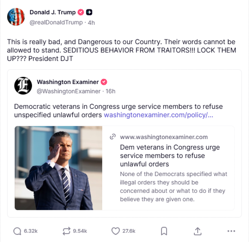 In the clip, they reminded active-duty service members of their oath to the Constitution, stating, "This administration is pitting our uniformed military and intelligence community professionals against American citizens. Like us, you all swore an oath. To protect and defend this Constitution. Right now, the threats to our constitution aren’t just coming from abroad, but from right here at home. Our laws are clear. You can refuse illegal orders. You must refuse illegal orders. No one has to carry out orders that violate the law or our Constitution."
