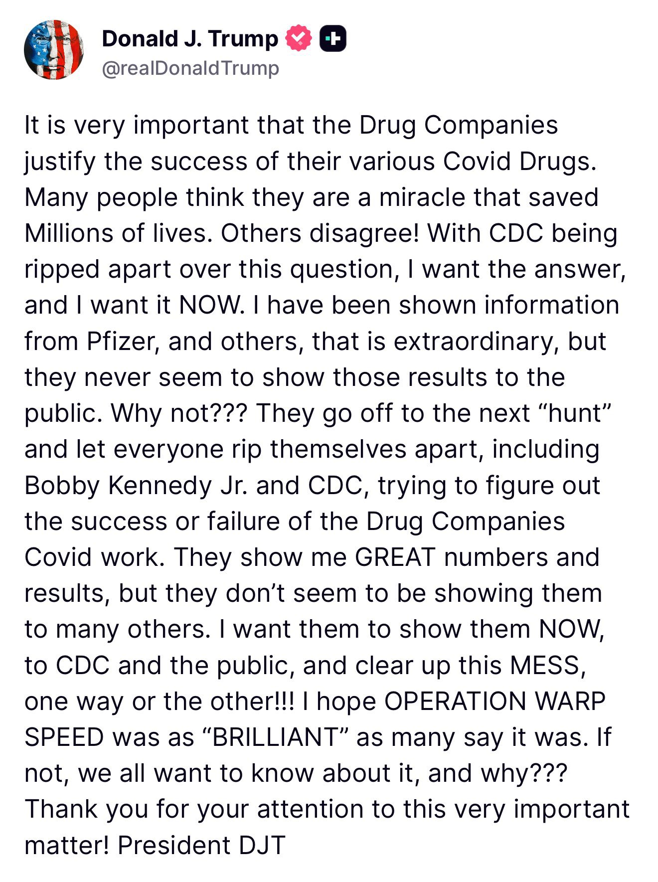 "It is very important that the Drug Companies justify the success of their various Covid Drugs. Many people think they are a miracle that saved Millions of lives. Others disagree! With CDC being ripped apart over this question, I want the answer, and I want it NOW," Trump wrote on Truth Social. “I have been shown information from Pfizer, and others, that is extraordinary, but they never seem to show those results to the public. Why not??? They go off to the next ‘hunt’ and let everyone rip themselves apart, including Bobby Kennedy Jr. and CDC, trying to figure out the success or failure of the Drug Companies Covid work."