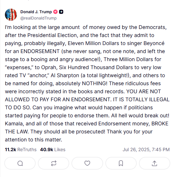 President Donald Trump has accused Vice President Kamala Harris’s 2024 presidential campaign of illegally paying celebrities, including Beyoncé, Oprah Winfrey, and MSNBC commentator Al Sharpton, for endorsements, alleging violations of federal election law.