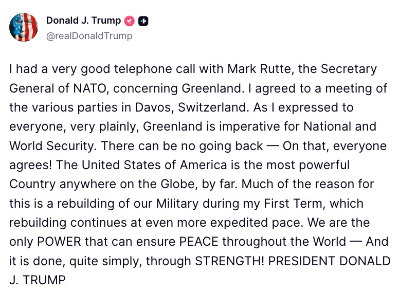 Trump also referenced a phone call with NATO Secretary General Mark Rutte, agreeing to discuss Greenland at the World Economic Forum in Davos.
