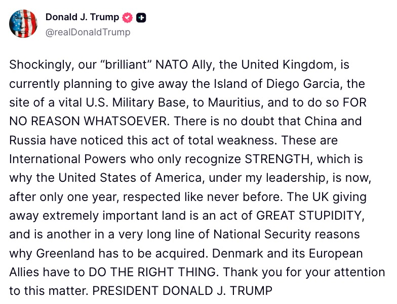 Trump also leaked a text from Macron proposing Paris talks and criticized the U.K.'s Chagos Islands transfer, linking it to Greenland's necessity.