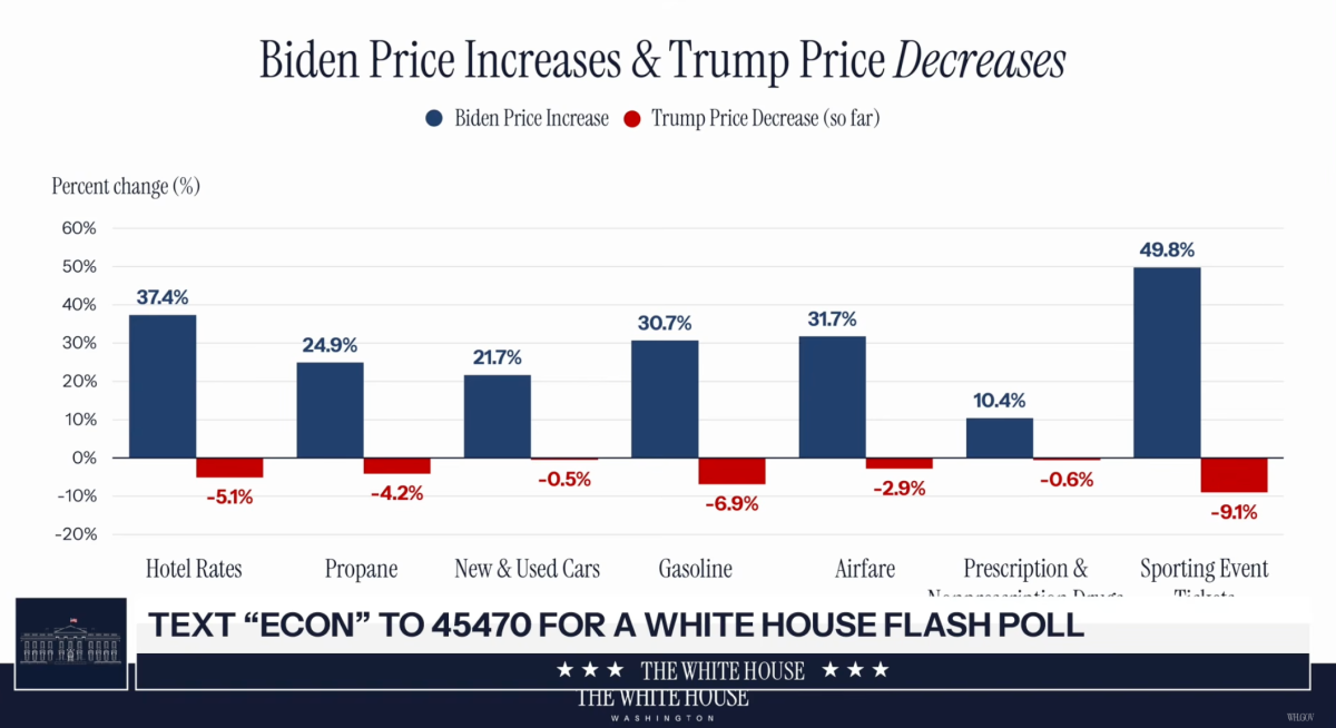 "Let’s look at the facts. Under the Biden administration, car prices rose 22 percent and in many states 30 percent or more," Trump stated. "Democrat politicians also set the cost of groceries. Sorry, but we are solving that too."