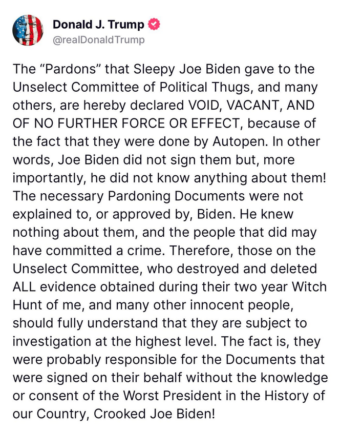 “The ‘Pardons’ that Sleepy Joe Biden gave to the Unselect Committee of Political Thugs, and many others, are hereby declared VOID, VACANT, AND OF NO FURTHER FORCE OR EFFECT, because of the fact that they were done by Autopen."