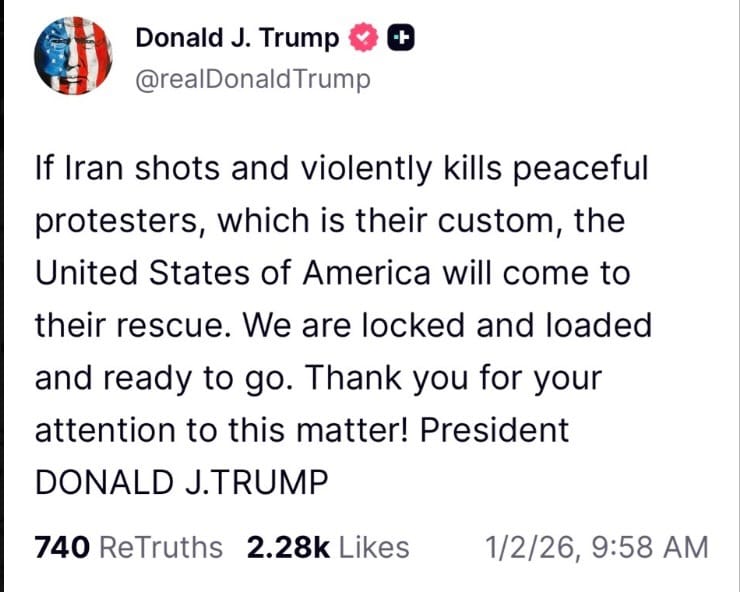 In a recent Truth Social Trump said, "If Iran shots and violently kills peaceful protesters, which is their custom, the United States of America will come to their rescue. We are locked and loaded and ready to go. Thank you for your attention to this matter! President."