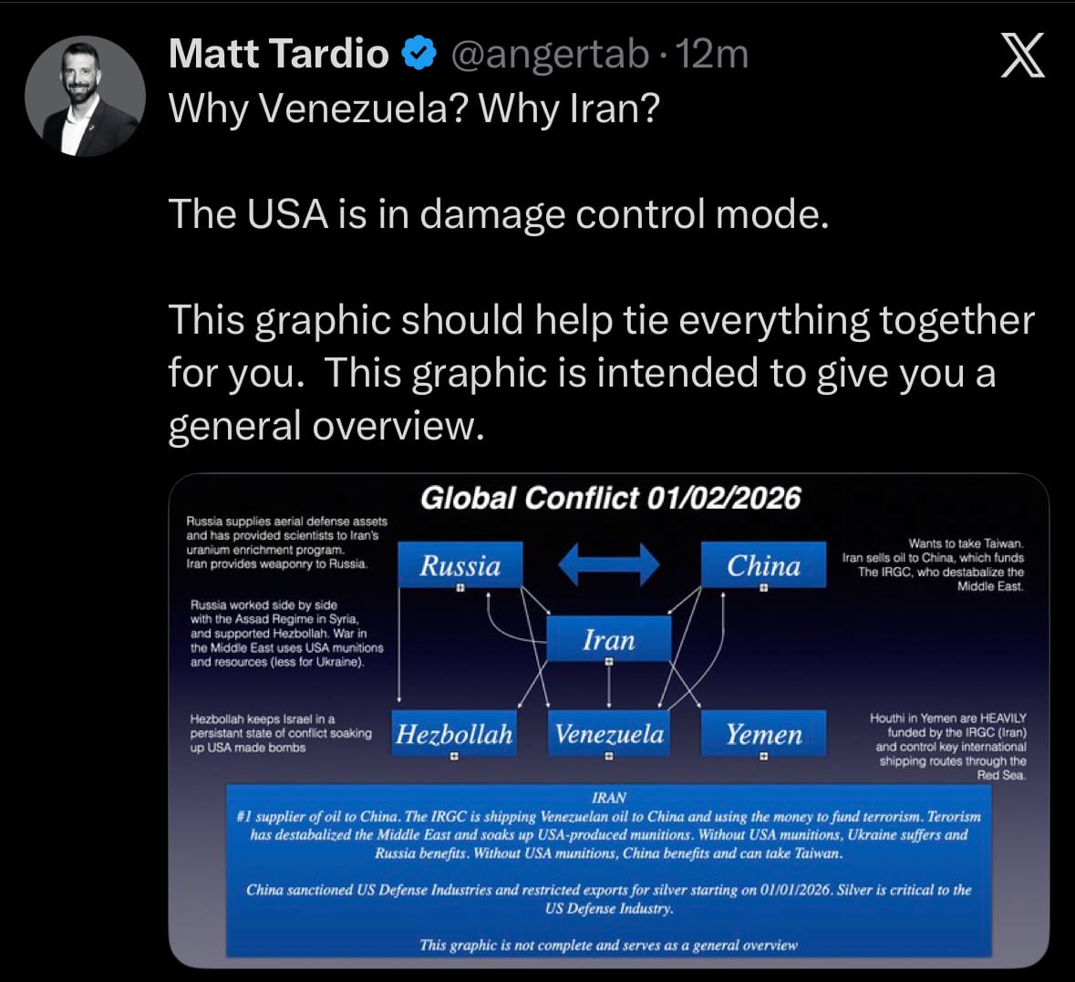 A recent X post by podcaster, Matt Tardio, frames Iran as essential proxy hub linking Russia and Chinese pressure against the US.