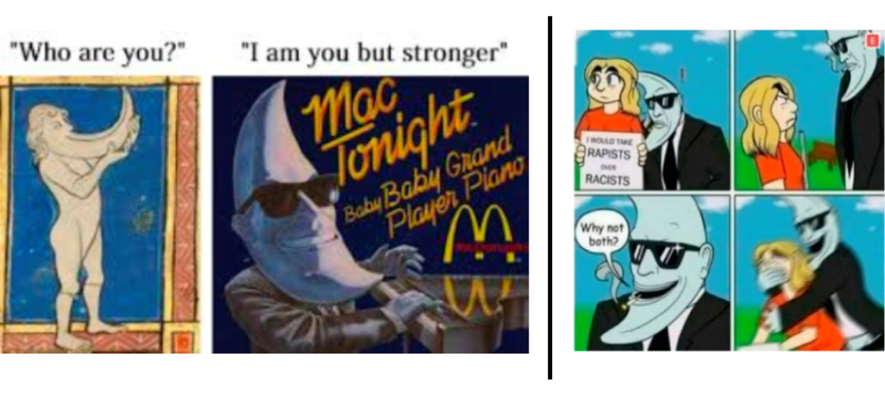 Mac Tonight’s metamorphosis into Moon Man started in 2007 when users of the “You’re the Man Now Dog” forum made a parody of it. Using computer-generated voices, internet users created parody rap songs, repurposing the Mc Donald’s character into something darker. Unfortunately, many of these songs featured offensive, racist, and violent lyrics and connotations—turning “Moon Man” into Mac Tonight’s Mr. Hyde.