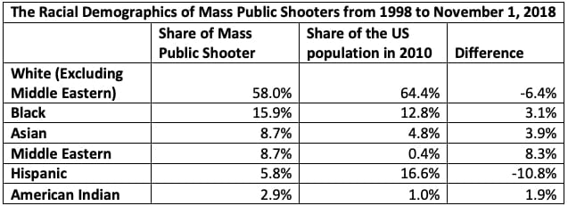 While the data set is small (non-gang related mass shootings are extremely rare) it's found that Middle Easterns are 24.17 times more likely than Whites, and Blacks are 1.38 times more likely than Whites to commit these crimes...