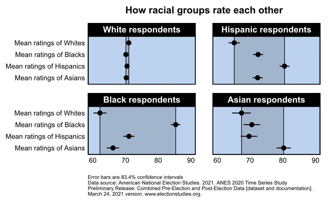 A 2021 study from American National Election Studies found that White people had the least amount of in-group preference and had the highest racial tolerance, while Blacks, Hispanics and Asians all had low racial tolerance toward Whites.